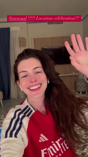 大牌球迷女星安妮-海瑟薇身穿阿森纳球衣唱歌,庆祝战胜皇马