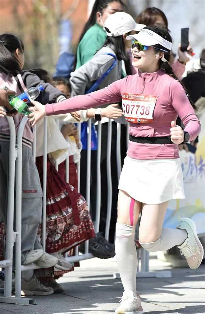 比赛当天,周娇跟着大部队慢慢跑,累了就走两步,和身边的跑友聊聊天,不知不觉就到了终点,用时2小时39分。“跑完之后,志愿者给我挂上奖牌,心里特别有成就感。”周娇说。